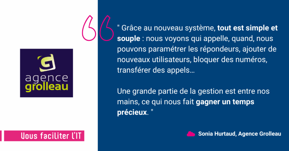 Sonia Hurtaud : « Grâce au nouveau système, tout est simple et souple : nous voyons qui appelle, quand, nous pouvons paramétrer les répondeurs, ajouter de nouveaux utilisateurs, bloquer des numéros, transférer des appels… Une grande partie de la gestion est entre nos mains, ce qui nous fait gagner un temps précieux. Et en cas de problème technique, l’équipe VFLIT est aussi très disponible et réagit rapidement. »